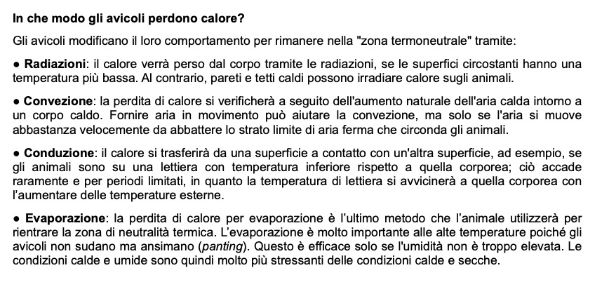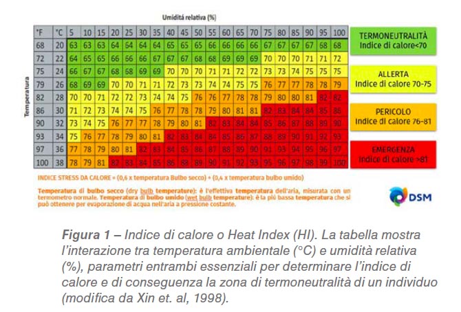 Gli avicoli hanno una temperatura corporea maggiore rispetto ai mammiferi, che oscilla tra 40 e 43 °C. La valutazione degli effetti positivi di una climatizzazione ottimale, cioè di una collocazione degli animali entro un range termico idoneo a ridurre al minimo la dispersione di calore verso l’esterno, è un punto fondamentale della gestione. Questo range corrisponde alla cosiddetta zona di neutralità termica, compreso fra una temperatura limite inferiore per conservare la omeotermia, una produzione addizionale di calore e quindi un incremento metabolico, e una temperatura più alta o temperatura limite superiore, al di sopra della quale divengono sempre più importanti i mezzi fisici regolatori della termo-dispersione (Figura 1). L’Indice di Calore o “Heat Index” (HI) è calcolato per stimare il disagio fisiologico causato dalla presenza di alte temperature ed elevati tassi di umidità. Come sempre infatti, il punto chiave da ricordare è che tanto più è alta l’umidità (relativa) tanto più l’organismo ha difficoltà nello smaltire il calore (perché è più difficoltosa l’evaporazione).