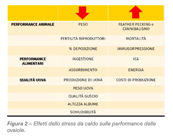Durante i periodi di stress da caldo, la maggior parte dell’energia viene impiegata per la termoregolazione, con conseguente immunosoppressione indotta da stress ossidativo, che predispone gli animali a varie malattie infettive e alti tassi di mortalità. Lo stress da caldo porta a un calo del peso corporeo, della produzione di uova, del peso delle uova, della qualità del guscio e dell’ingestione.