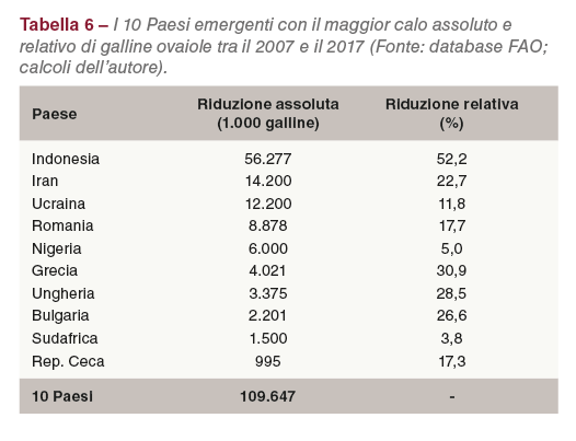 Non tutti i Paesi emergenti sono stati in grado di aumentare i propri allevamenti di galline ovaiole nel decennio analizzato. La Tabella 6 mostra che le dieci regioni in cui sono diminuiti gli allevamenti di ovaiole, insieme hanno perso 109,6 milioni di galline. Cinque di questi dieci Paesi si trovano nell’Europa orientale e sei sono Stati membri dell’UE. Mentre la causa principale del declino in questi paesi è stata la trasformazione, nell’Unione Europea, da gabbie convenzionali a sistemi di alloggio alternativi a partire dal 2012, i problemi politici ed economici sono stati i principali fattori di questa variazione in Ucraina e in Venezuela.