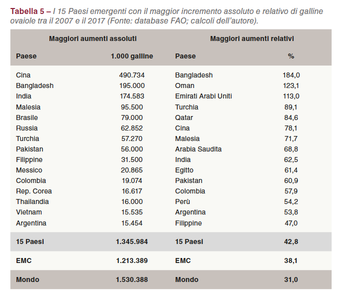 La Tabella 5 elenca i quindici Paesi emergenti con la più alta crescita assoluta e relativa delle loro scorte di galline ovaiole. La composizione e la classifica dei Paesi rispetto alla crescita relativa non è identica a quella dell’aumento assoluto, come si evince facilmente dal confronto.