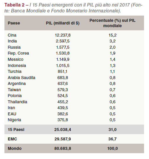 Il PIL mondiale ha raggiunto un volume di 80.683,8 bilioni di $. A questa cifra i Paesi emergenti hanno contribuito con 29.587,9 bilioni di $, pari al 36,7%. All’interno del gruppo i valori differivano notevolmente. Mentre la Cina ha generato un PIL di 12.238 bilioni di $, pari al 15,2% del PIL mondiale, la Nigeria ha raggiunto solo 375,8 milioni di $, pari allo 0,5% (Tabella 2).