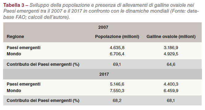 Nella Tabella 3 sono confrontati con la dinamica globale lo sviluppo della popolazione, le scorte di galline ovaiole e la produzione di uova tra il 2007 e il 2017.
