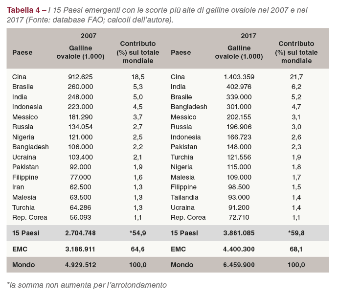 In questo lavoro verrà utilizzato un elenco di 37 Paesi dei mercati emergenti (EMC), basato sulle classificazioni della Banca mondiale, del Fondo Monetario Internazionale e dalla FAO.[1] Nel 2017 essi hanno condiviso il 68,2% della popolazione mondiale, il 68,1% dell’inventario mondiale delle galline ovaiole e il 73,4% della produzione mondiale di uova.