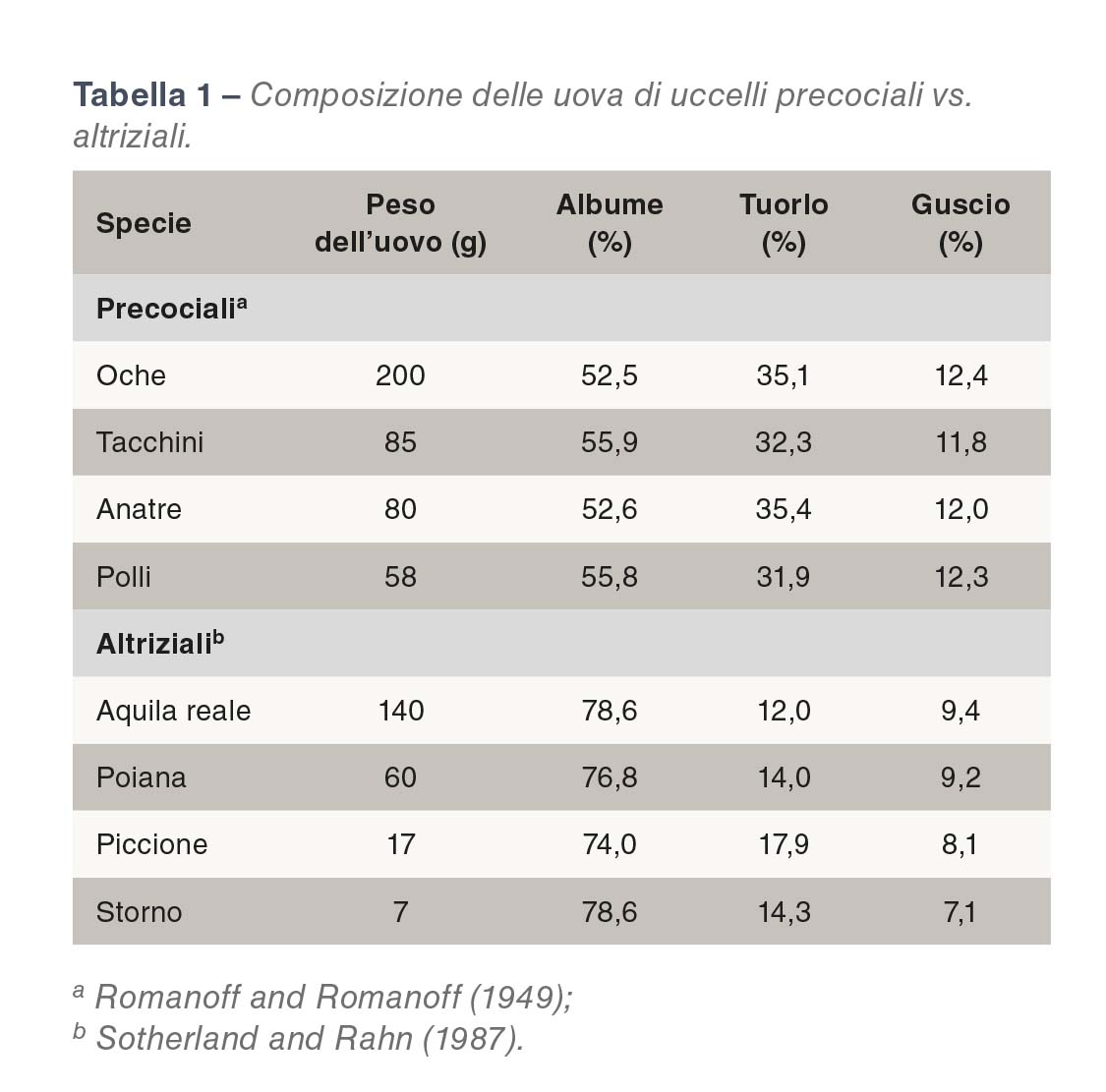 Come descritto più di un secolo fa e analizzato più dettagliatamente in tempi recenti, le uova sono costituite da tre parti principali: guscio, tuorlo e albume. I consumatori possono preferire un colore più o meno pronunciato del tuorlo e apprezzare il gusto di un uovo alla coque o l’aspetto delle uova fritte con il tuorlo ben in evidenza. Il tuorlo ha più sapore dell’albume, mentre il guscio ha funzioni importanti, ma nessun valore nutritivo. La selezione naturale in diverse specie ha favorito uova con dimensioni ottimali per la schiusa e come pacchetto di sopravvivenza per l’embrione in via di sviluppo. Sono state riportate sorprendenti somiglianze (e differenze) tra le specie per la percentuale di tuorlo in un’ampia gamma di pesi delle uova e tipo di volatili (Tabella 1). Le stime per le specie antiche sono interessanti nel contesto attuale, perché si riferiscono a volatili prima dell’inizio della selezione moderna, quando le razze a duplice attitudine producevano in media meno di 150 uova all’anno. Le uova degli uccelli acquatici hanno più tuorlo rispetto a polli e tacchini, mentre i piccioni e altre specie precociali hanno una percentuale di tuorlo molto inferiore. In Nuova Zelanda il volatile Kiwi depone un solo uovo estremamente grande (rispetto alle dimensioni del corpo) all’anno, con una percentuale di circa 2/3 di tuorlo e 1/3 di albume.