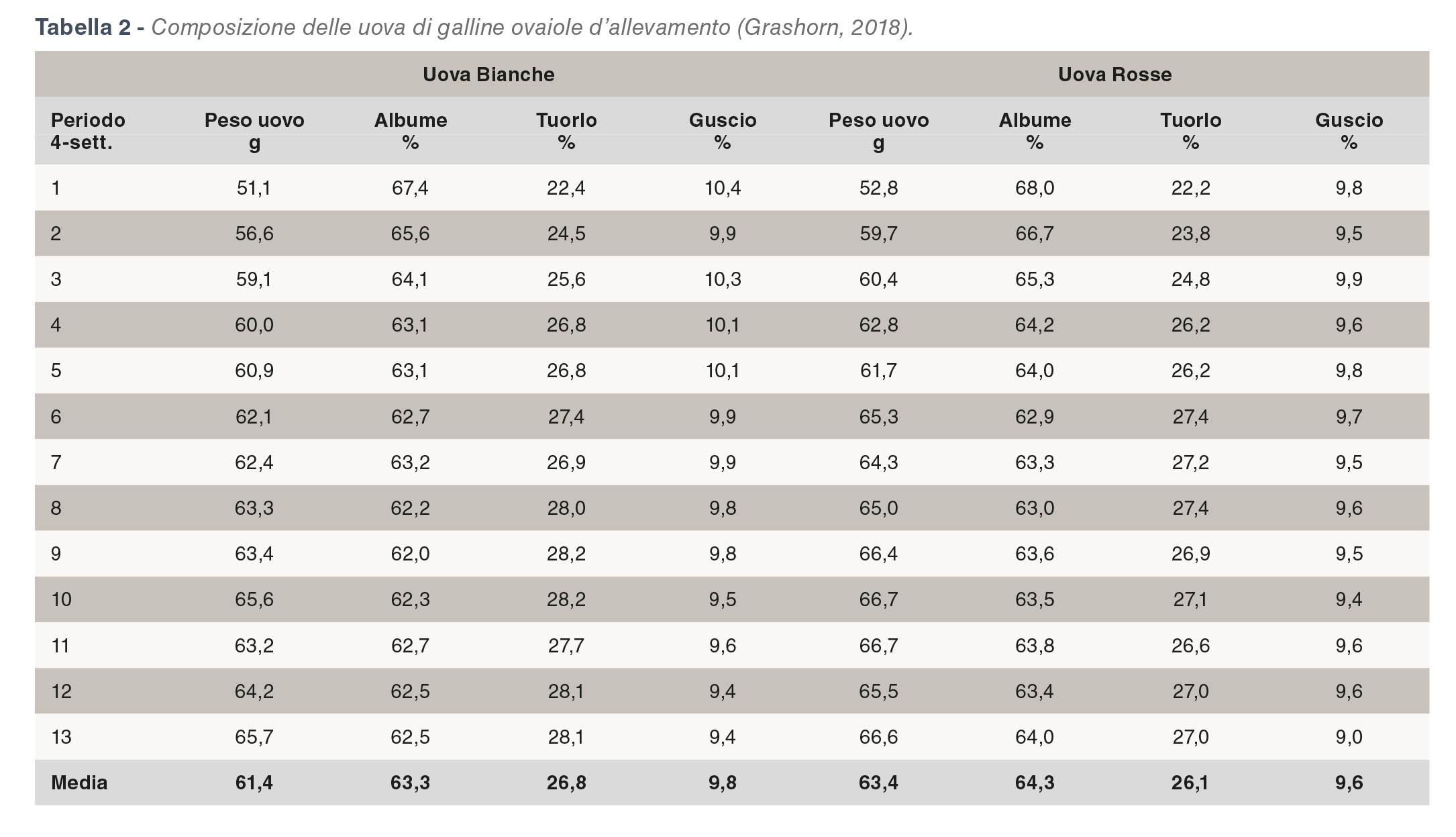 Grashorn (2018) ha recentemente analizzato la composizione dell’uovo in una razza dalle uova bianche e una dalle uova rosse durante un intero anno di deposizione (Tabella 2). I risultati della ricerca hanno mostrato un consistente effetto dell’età in entrambe (la percentuale di tuorlo inizia bassa e aumenta in modo significativo fino al picco di produzione). Rispetto ai dati pubblicati da Tharington 20 anni fa, la percentuale di tuorlo nelle ovaiole di oggi è leggermente inferiore nella seconda metà del periodo di deposizione, ma notevolmente inferiore sull’intero periodo. La razza Livornese ha mostrato un piccolo, ma consistente vantaggio in termini di percentuale di tuorlo e guscio durante tutto il periodo di deposizione.