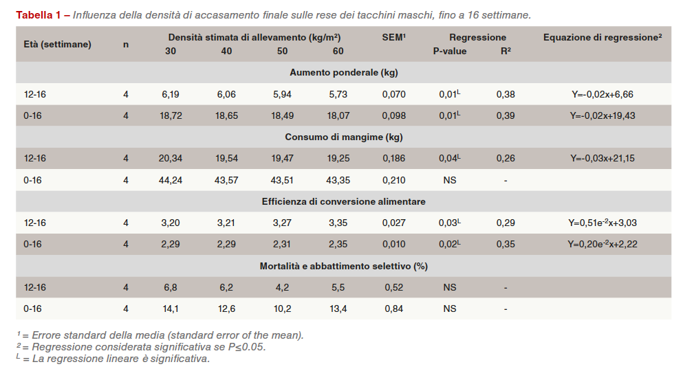 I risultati presentati sono solo quelli della settimana 16. Le rese dei tacchini (Tabella 1) erano influenzate negativamente con una maggiore densità di accasamento (P=0,01). Questo calo era stato rilevato anche in studi precedenti. Il consumo alimentare e l’efficienza erano influenzati negativamente aumentando la densità nelle ultime 4 settimane, e comunque solo la conversione era influenzata negativamente nel corso dell’intera prova (0-16 settimane). La conversione non era influenzata dall’aumento di densità, come è stato dimostrato anche in altri studi, mentre alcune prove mostrano notevoli peggioramenti nell’efficienza alimentare. La mortalità totale (Tabella 1) e l’uniformità del gruppo, non evidenziata, non erano influenzate dall’aumento di densità. Mentre la mortalità non era significativamente differente in questa prova, due altre prove evidenziavano mortalità maggiore in relazione alla densità.