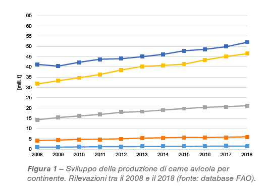 Tra il 2008 e il 2018 la produzione mondiale di carne avicola è passata da 92,7 milioni di tonnellate a 127,3 milioni di tonnellate (+37,4%). Parallelamente a questa notevole crescita, anche la concentrazione regionale è cresciuta considerevolmente (Figura 1).