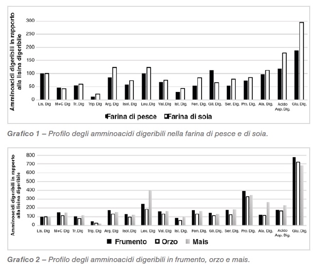 L’Enterite necrotica subclinica provoca crescite rallentate e un calo del consumo di mangime dovute soprattutto ai danni provocati alla mucosa intestinale; per rispondere a questa condizione vengono mobilitati gli amminoacidi necessari alla risposta immunitaria utilizzando le proteine destinate allo sviluppo muscoloscheletrico. Rispetto al panello di soia, l’aggiunta di farina di pesce spesso causa una carenza di arginina (Arg), leucina (Leu), acido aspartico (Asp) istidina (His) fenilalanina (Phe) e acido glutammico (Glu) (Grafico 1 – adattato da Lemme et al., 2004). Rispetto al mais l’uso di frumento e orzo potrebbe comportare carenze di alanina, leucina e acido aspartico (Grafico 2 – adattato da Lemme et al., 2004).