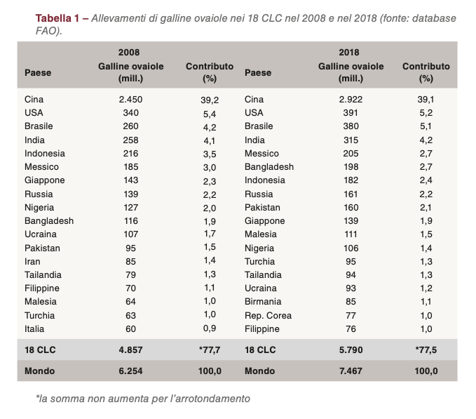 Nel 2018 5,2 miliardi di persone, pari a quasi i tre quarti della popolazione mondiale, viveva nei 18 Paesi su cui si concentra l’analisi di questo articolo, d’ora in poi anche denominati CLC (Champions League Countries). Questi Paesi hanno contribuito per il 77,5% alle scorte mondiali di ovaiole; dodici di questi Paesi si trovano in Asia, tre nelle Americhe, due in Europa e uno in Africa (Tabella 1).
