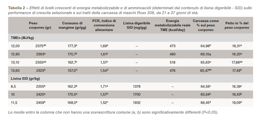 Evonik (2017) ha illustrato le perdite produttive conseguenti all’uso di diete a basso contenuto proteico (Tabella 2). I polli da carne di oggi sono altamente sensibili a un aumento del livello di proteine in termini di peso corporeo, indice di conversione (FCR) e resa in carne del petto. Tale effetto sembra dipendere dal contenuto energetico nelle diete.