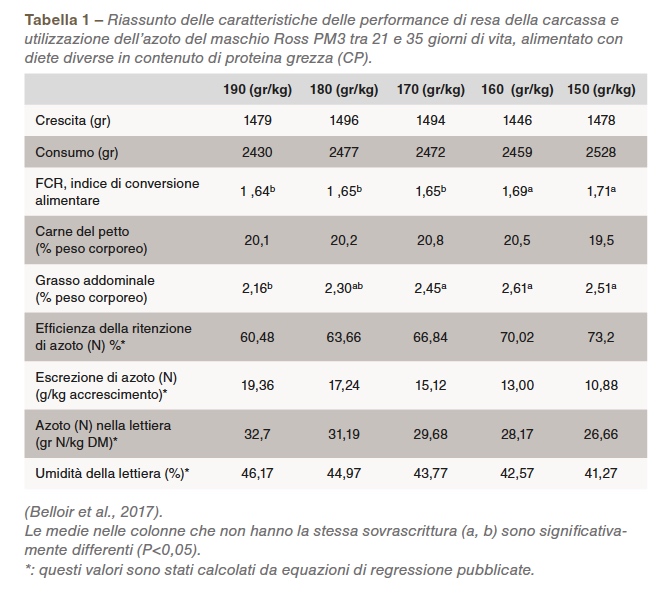 Alhotan e Pesti (2016) sottolineano l’importanza di soddisfare i requisiti di aminoacidi non essenziali, dimostrando che i fabbisogni per la crescita e per la conversione del mangime sono diversi, ma esiste un rapporto ideale tra il livello di aminoacidi della dieta e il suo contenuto proteico reale (TP). In pratica, le proteine nella dieta possono essere ridotte al punto da compromettere le prestazioni. Belloir et al. (2017) hanno valutato l’impatto della riduzione della CP nella dieta di broiler (Tabella 1). Il rapporto fra conversione del mangime (FCR) e resa in carne del petto risulta ridotto nelle diete a basso contenuto proteico, mentre aumenta il grasso addominale. Anche i dati sull’utilizzo sono piuttosto interessanti: l’efficienza di ritenzione dell’azoto (N) aumenta con una riduzione della proteina grezza (CP). Ogni riduzione proteica dell’1%, in formulazioni tra il 19 e il 16% di CP, contribuisce a ridurre l’escrezione di azoto del 13%, con benefici anche sull’umidità della lettiera.
