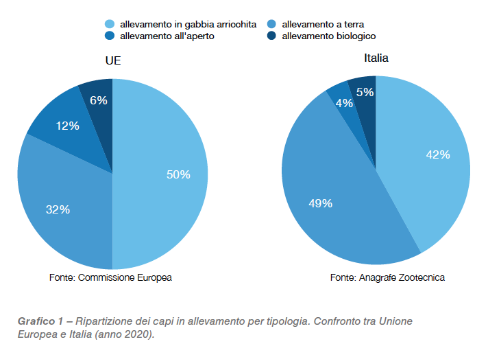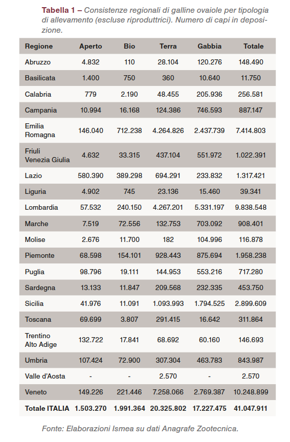 La produzione italiana nel 2020 dovrebbe attestarsi su oltre 12,6 miliardi di uova, pari a circa 796 mila tonnellate di prodotto. La produzione nel 2020 è stata garantita da 41 milioni di galline ovaiole accasate in oltre 2.600 allevamenti, di cui 1.444 di grandi dimensioni, cioè con più di mille capi. Il 75% del patrimonio animale è concentrato nel Nord Italia, soprattutto in Veneto, Lombardia e Emilia-Romagna. Secondo i dati registrati in Anagrafe Nazionale, nel 2020 il 49% dei capi in deposizione è allevato “a terra”, il 42% in allevamenti con “gabbie arricchite”, il 4% in allevamenti all’aperto e il 5% in allevamenti biologici.