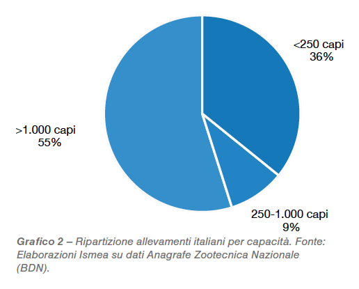 Oltre la metà degli allevamenti presenti sul territorio nazionale è di grandi dimensioni, con una capienza superiore a 1.000 capi, mentre sono solo il 9% ha una dimensione compresa tra 250 e 1.000 capi (Grafico 2).