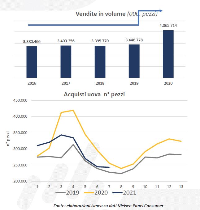 La commercializzazione delle uova avviene soprattutto attraverso la Grande Distribuzione. Nei primi sette mesi del 2021 si è avuto un ridimensionamento degli acquisti rispetto al 2020, ma i volumi restano superiori a quelli degli anni precedenti, con un +10,6%.