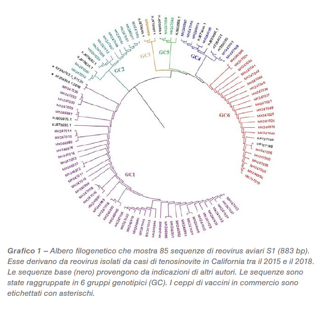 I metodi di caratterizzazione parziale del gene S1 hanno classificato i ceppi di reovirus aviari in 5 e 6 gruppi genotipici. La presente ricerca ha dimostrato che i ceppi isolati in California appartengono ai sei distinti cluster genotipici. I gruppi predominanti sono stati GC1 (51,8%), seguito da GC6 (24,7%) e GC2 (12,9%). Risultati simili sono stati descritti anche in Europa. Lu et al. hanno notato che la maggior parte delle sequenze apparteneva a GC5, seguito da GC4 e GC1. Palomino et al. hanno rilevato un maggiore numero di GC5, seguiti da GC4 e GC1.