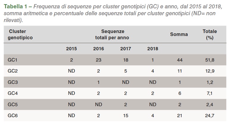 Nel Grafico 2 viene presentato un riassunto della distribuzione delle sequenze in diversi gruppi genetici e delle loro omologie per ciascun anno. Alla notevole riduzione delle sequenze raggruppate nel GC1 è seguito un aumento di GC2, GC4 e GC6. GC3 è stato identificato per la prima volta nel 2016, mentre GC5 nel 2017. 17 isolati associati a forma clinica in campo sono stati selezionati per la completa sequenziazione genomica e sierotipica.
