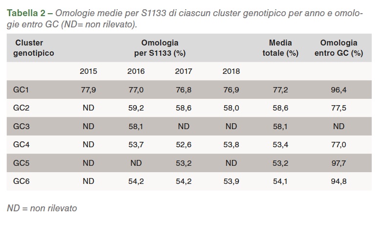 La percentuale di omologia rispetto a S1133 delle sequenze S1 per ogni anno è stata consistente: GC1 è stato il gruppo con l’omologia maggiore rispetto a S1133, mentre i gruppi GC4, GC5 e GC6 presentavano quella minore. Per stabilire la similarità delle sequenze S1 entro ciascun gruppo, è stata calcolata l’omologia dei vari cluster GC. Da alta a bassa, le omologie sono state: GC1 (96,4%), GC2 (77,5%), GC4 (77,0%), GC5 (97,7%) and GC6 (94,8%), vedi Tabella 2.