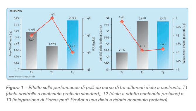 In Figura 1 si osserva come l’integrazione di 200 g/t di Ronozyme® ProAct a una dieta a ridotto contenuto proteico (T3), ha dato migliori risultati rispetto a una dieta analoga senza ProAct (T2) e ha eguagliato le performance zootecniche del gruppo alimentato con una dieta a contenuto proteico normale (T1).