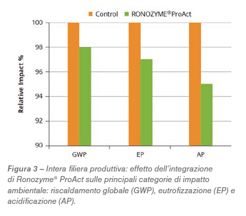 Una metodologia nota come LCA (Life Cycle Assessment) viene spesso utilizzata per valutare efficacemente l’impatto ambientale dei sistemi di produzione, compresa quella zootecnica. LCA considera l’intera filiera produttiva, partendo dalla produzione di materie prime e terminando con lo smaltimento dei rifiuti. Vengono raccolti dati specifici per ogni processo che si suddividono in input (corrente elettrica, mangime, carburante, etc.) e output (vendita animali, carne, uova, etc.). Uno studio LCA di Leinonen e Williams (2015) ha quantificato l’impatto ambientale complessivo quando DSM Ronozyme® ProAct è stato integrato nel mangime utilizzato per la produzione standard di polli da carne. Questa valutazione LCA era per diete a base di soia senza proteasi: il gruppo di controllo, che riceveva una dieta con contenuto standard di proteina, è stato confrontato con un gruppo Trattato integrato con ProAct. Nella dieta del gruppo Trattato, anche il contenuto di proteine e aminoacidi è stato ridotto in linea con i miglioramenti di digeribilità propri dell’enzima (matrici). Sono stati valutati sette studi separati e due scenari: la filiera del mangime e la filiera produttiva del pollo da carne. L’analisi della filiera del mangime ha mostrato che con ProAct si è osservata una riduzione per tutte le categorie di impatto ambientale valutate (Figura 2). La riduzione è stata particolarmente significativa per il GWP con il 12% di riduzione e una media del 5%. Il motivo principale di questo miglioramento è dovuto alla minor inclusione di soia nella dieta, che ha ridotto le emissioni di CO2; in un LCA impatta anche lo sfruttamento del suolo di una coltura e il suo trasporto, pertanto, riducendo la quantità di soia nella razione, ne deriva un minor impatto ambientale. Miglioramenti significativi sono stati osservati anche in EP e AP. È stata osservata una grande riduzione sia di EP che di AP quando è stata considerata l’intera filiera produttiva (Figura 3). La riduzione di AP, massima di 9% e media del 5%, è dovuta alla riduzione di NH3.