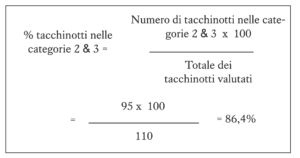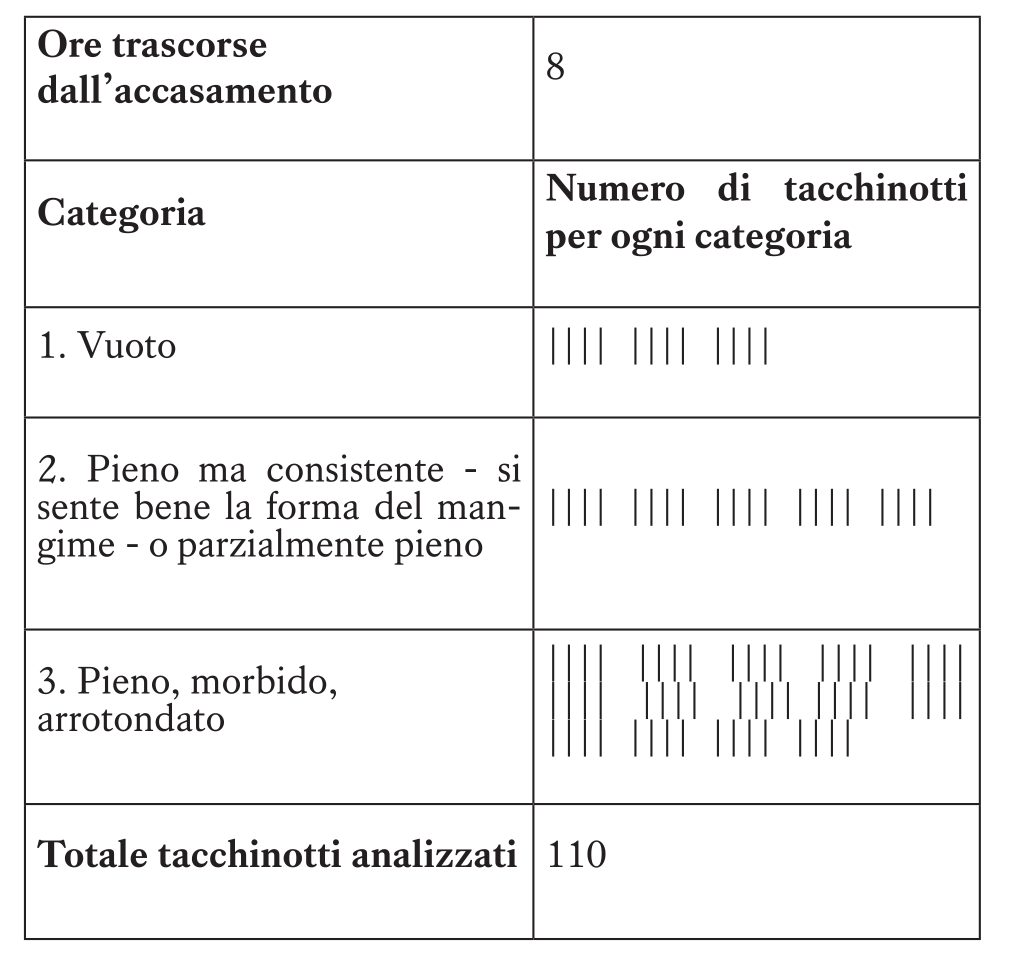 Calcolare la percentuale (%) di tacchinotti nelle categorie 2 e 3 dividendo il numero di tacchinotti appartenenti alle due categorie per il numero totale di tacchinotti valutati e moltiplicando per 100 (vedi Tabella 2).