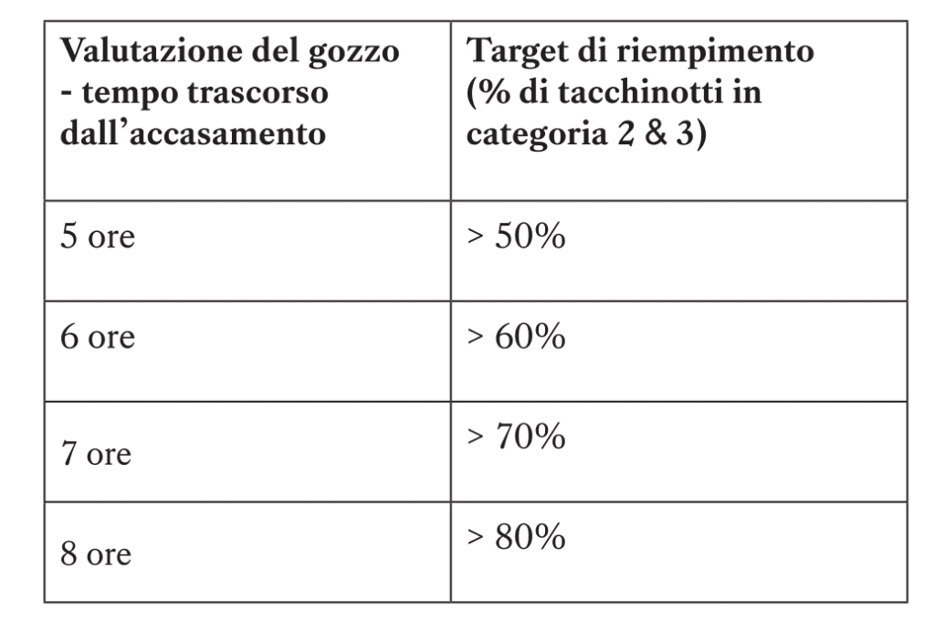 Il riempimento del gozzo dovrebbe essere monitorato tra le prime 5-8 ore dopo l’accasamento e indicherà se i pulcini hanno trovato mangime e acqua. Secondo i nostri studi, eseguire l’analisi del riempimento del gozzo tra le 5 e le 8 ore fornisce una rappresentazione più precisa di come i pulcini si sono accasati e del loro sviluppo iniziale. Per ottenere risultati accurati, è necessario valutare almeno 100 tacchinotti in diversi punti.