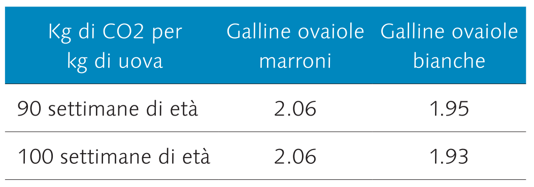 In termini di impronta di carbonio per chilogrammo di uova prodotte, le galline ovaiole bianche tendono a superare quelle brune in efficienza. Le galline ovaiole bianche, infatti, emettono circa il 5,33% in meno di CO2 per ogni chilogrammo di uova prodotte rispetto alle galline ovaiole marroni. Fino a 90 settimane di età, le galline marroni emettono 2,06 kg di CO2 per kg di uova, mentre le galline bianche emettono solo 1,95 kg di CO2 per lo stesso quantitativo di uova. A 100 settimane, la differenza diventa ancora più marcata, con le galline marroni che emettono il 6,31% in più di CO2 per la produzione di uova rispetto alle galline bianche.