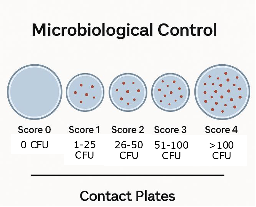 Una volta all’anno, dopo la disinfezione effettuata nella pausa di pulizia, vengono utilizzate piastre a contatto per valutare la flora totale.