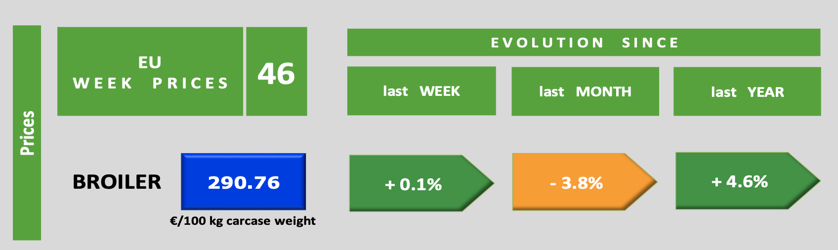 Nella settimana 46, il prezzo medio europeo del broiler è pari a 290,76 €/100 kg carcase weight/peso carcassa.