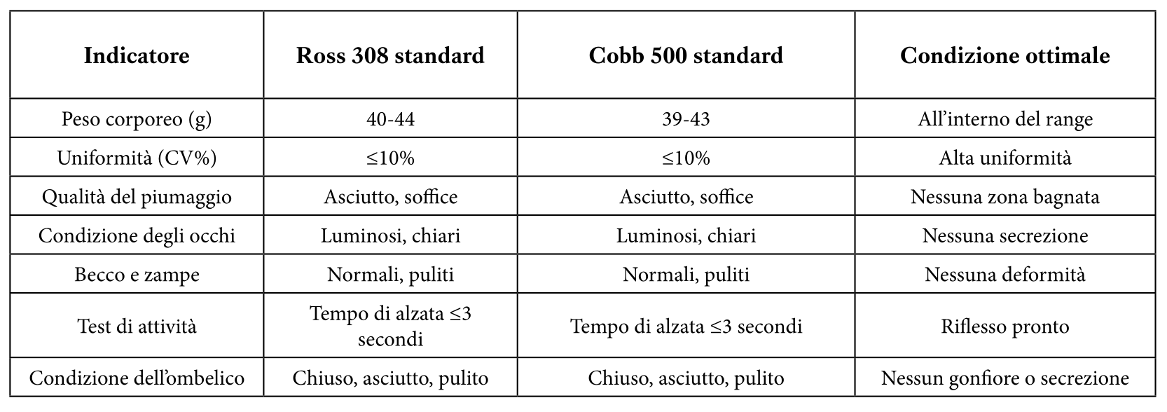 • Assorbimento del sacco vitellino: il residuo del tuorlo dovrebbe essere inferiore al 10% del peso corporeo per garantire un’ottimale immunità ed energia.