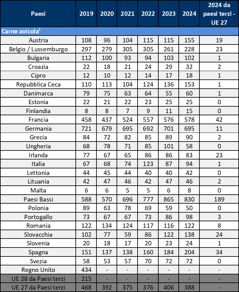 Guardando invece alla produzione di carne di pollame nel resto del mondo, di 140.621 tonnellate, in aumento rispetto al 2023, al primo posto si trova la Cina, seguita da Usa e Brasile, tutti e tre in aumento rispetto all’anno precedente (Tabella 2).
