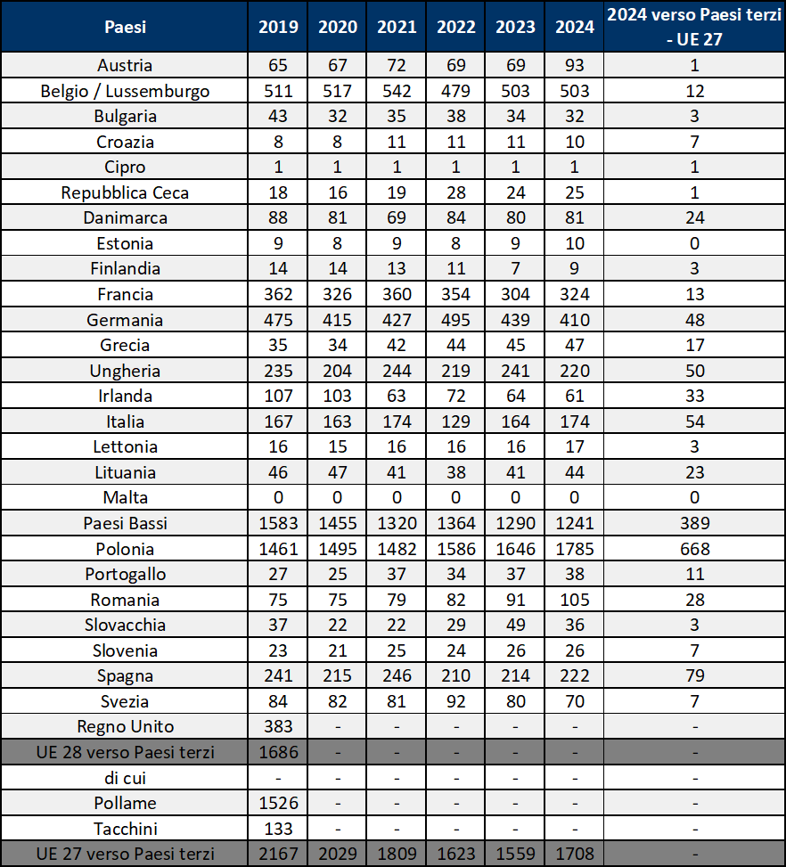 Passiamo ora alle importazioni e alle esportazioni. In UE i maggior importatori di carne di pollame sono Paesi Bassi e Germania, entrambi in diminuzione rispetto all’anno precedente, e Francia, in leggero aumento (Tabella 3).