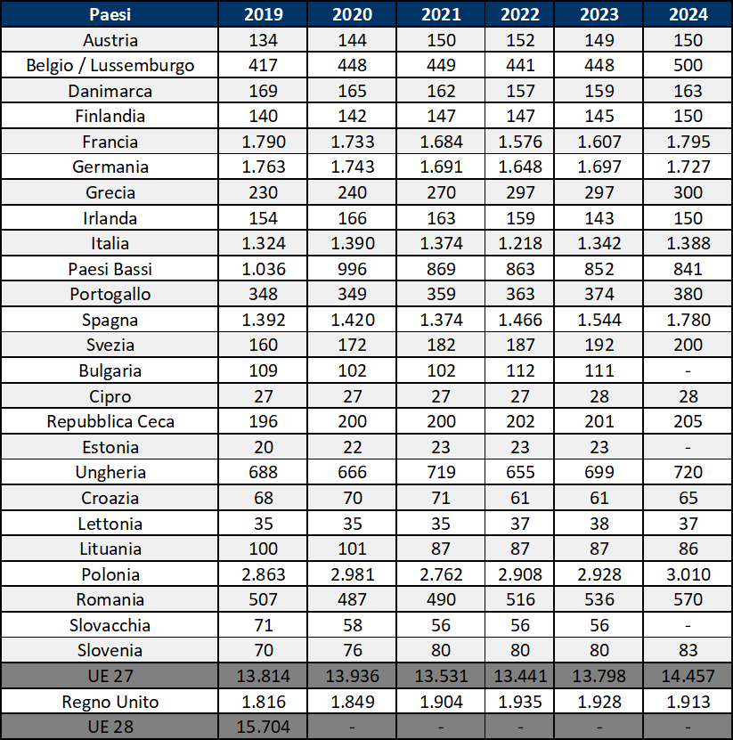Come nel 2023, anche nel 2024 sul podio della maggiore produzione si trovano Polonia, UK e Francia. Mentre Polonia e Francia sono in aumento rispetto agli anni passati, la produzione dell’UK subisce una leggera flessione rispetto al 2023. (Tabella 1)