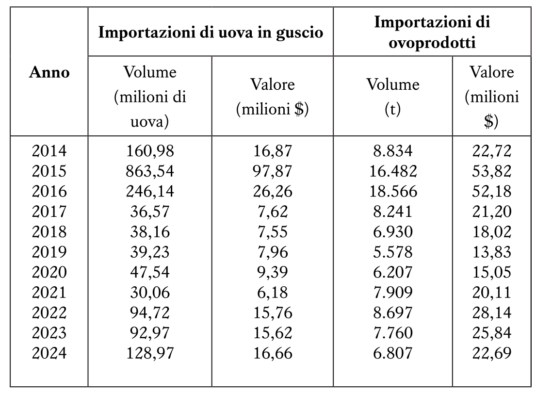 Nelle grandi aree urbane del nord-est e in California, i prezzi al dettaglio hanno toccato in alcuni momenti i 10 dollari a dozzina, provocando proteste da parte della popolazione e costringendo il governo a intervenire. L’industria degli ovoprodotti, in particolare, ha avuto problemi a consegnare le quantità contrattualizzate perché non riusciva a procurarsi le uova necessarie, o poteva farlo solo a un prezzo molto più elevato. Come alcune catene di supermercati, essa ha fatto pressioni per importare uova al fine di poter continuare a produrre a un livello che coprisse i costi. Poiché l’epidemia di influenza aviaria del 2015 colse gli allevatori di galline ovaiole impreparati, il deficit di approvvigionamento fu particolarmente elevato. Tra la fine del 2015 e l’inizio del 2016 furono importate oltre 1,1 miliardi di uova per un valore di 124 milioni di dollari e 35.000 t di ovoprodotti per un valore di 106 milioni di dollari. Sebbene dopo le epidemie del 2022 e del 2023/24 le importazioni siano state inferiori in volume, esse hanno raggiunto un valore complessivo di 124,7 milioni di dollari (Tabella 3).