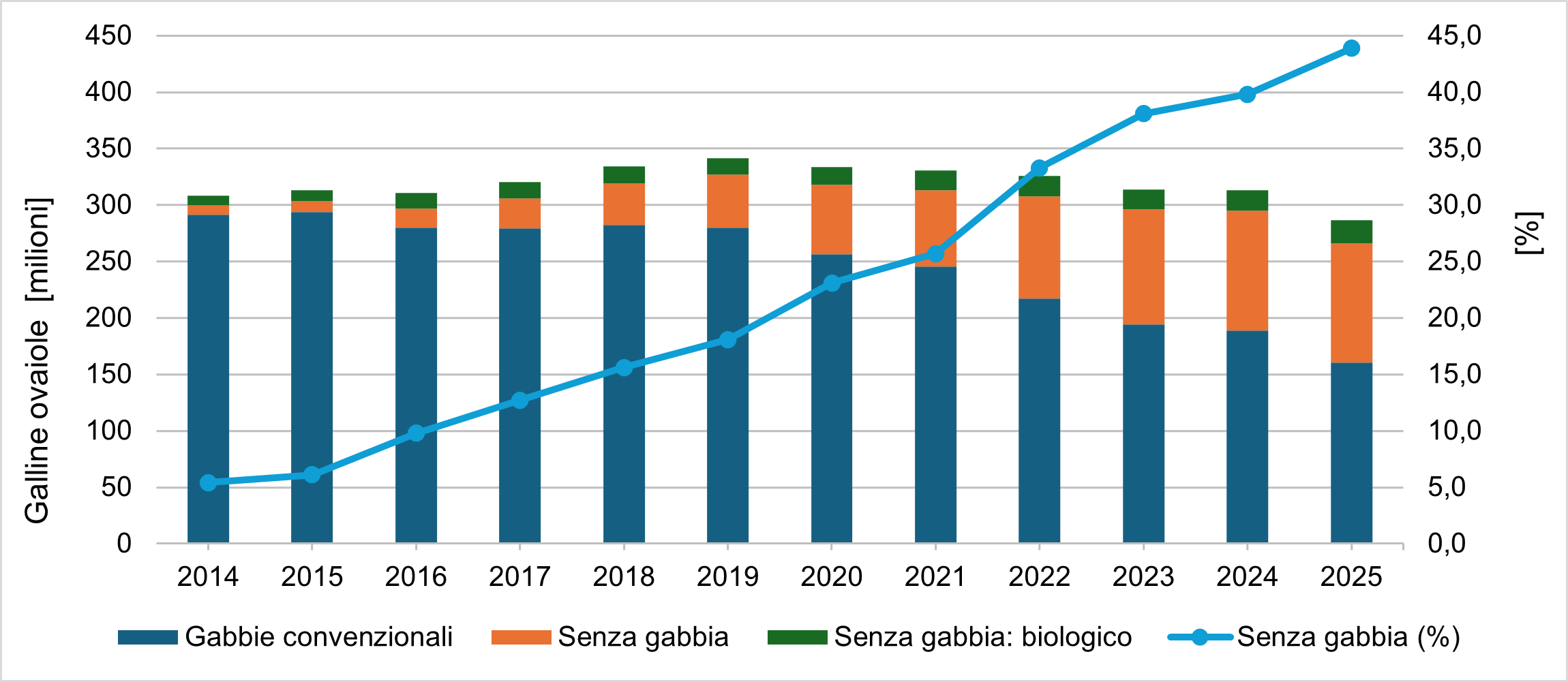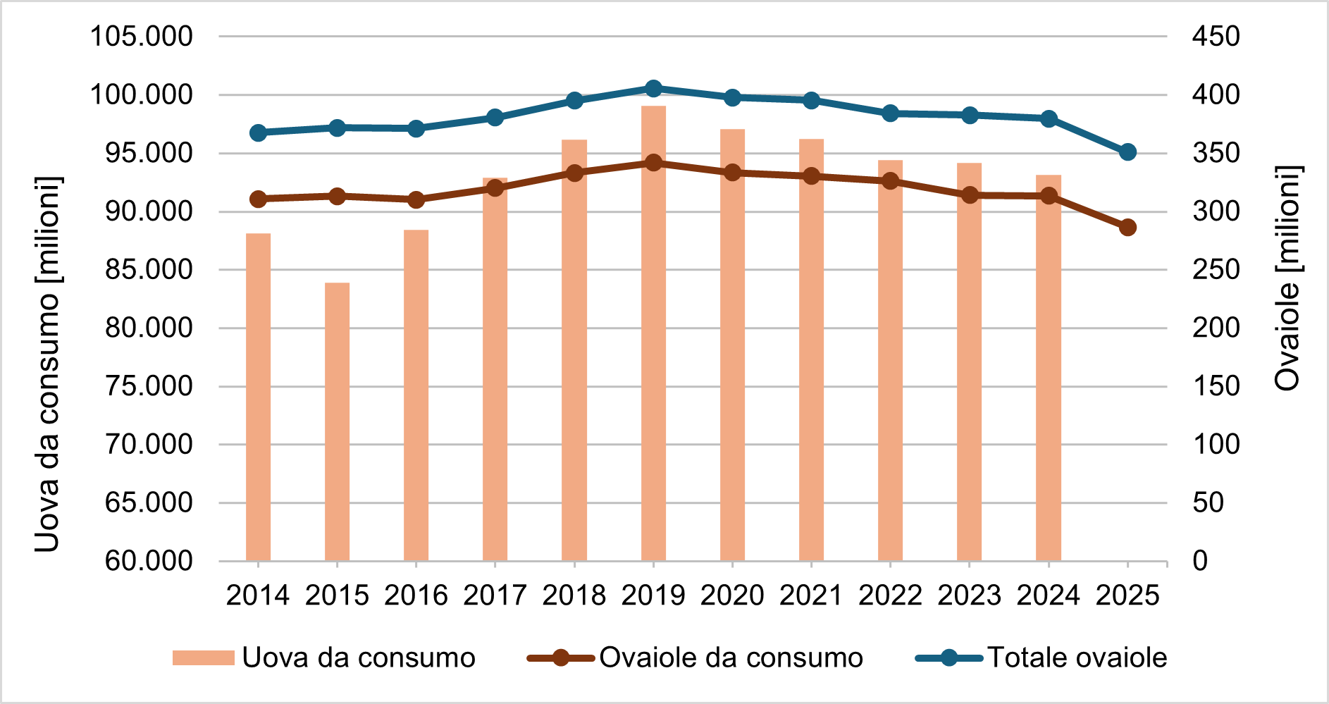 ▲ Figura 1 – Andamento del numero di galline ovaiole e della produzione di uova da consumo negli Stati Uniti dal 2014 al 2025