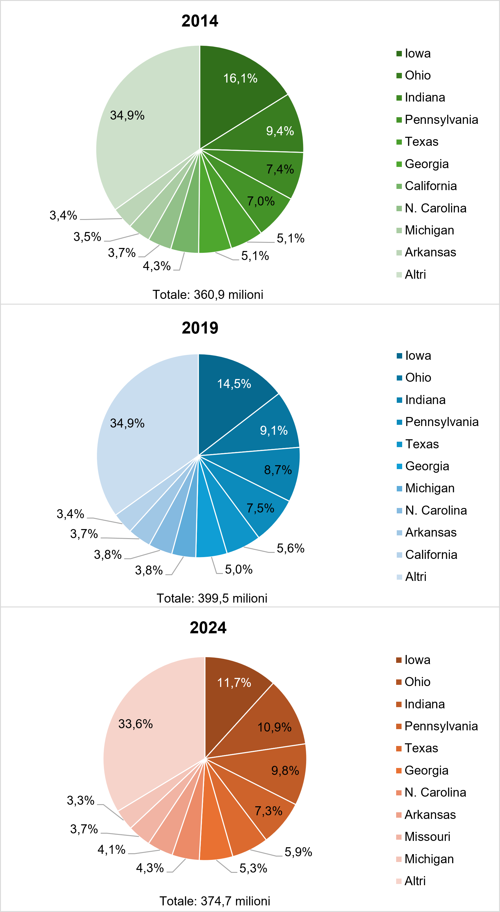 Figura 2 – Quota dei dieci principali stati sul numero di galline ovaiole negli Stati Uniti nel 2014, 2019 e 2024 Elaborazione di A. S. Kauer basata su dati USDA, NASS.
