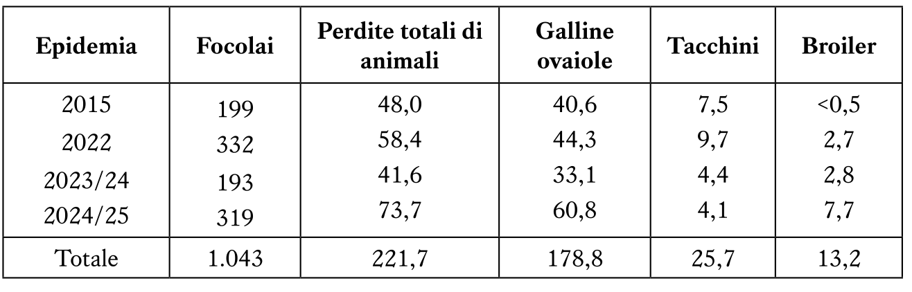 Tabella 1 – Focolai di HPAI e perdite di animali negli USA fra aprile 2015 e luglio 2025; dati in milioni