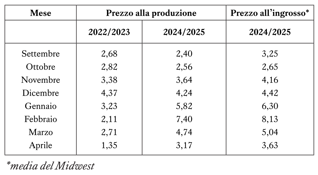 Tabella 2 – Andamento dei valori delle uova al prezzo della produzione e al prezzo all’ingrosso dopo i focolai di influenza aviaria del 2023 e del 2024/25 negli Stati Uniti; dati in $ per dozzina Fonte: Egg Industry Center, Iowa State University.