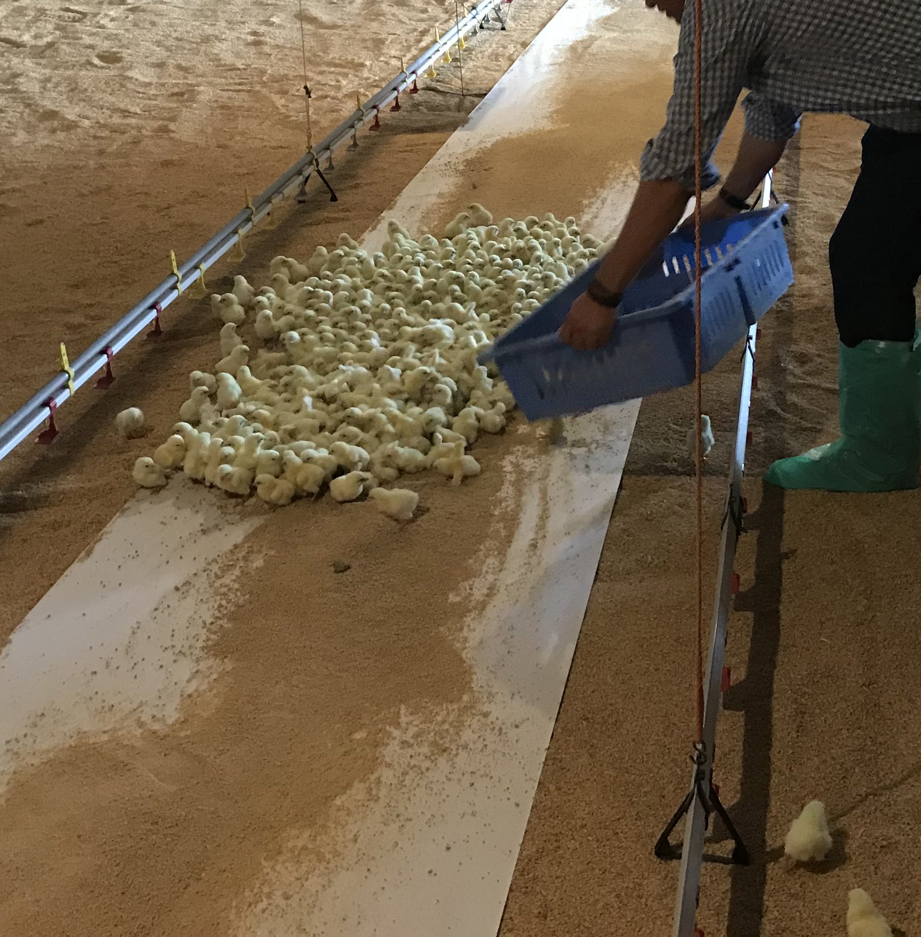 Il personale dell’allevamento deve collocare i pulcini con delicatezza, rispettando i limiti di altezza di caduta stabiliti dall’azienda. L’altezza massima di caduta non deve superare i 15 cm, il che significa che l’operatore deve tenere la cassetta saldamente con entrambe le mani e inclinare la cassetta minimizzando la distanza dal fondo della cassetta alla lettiera.