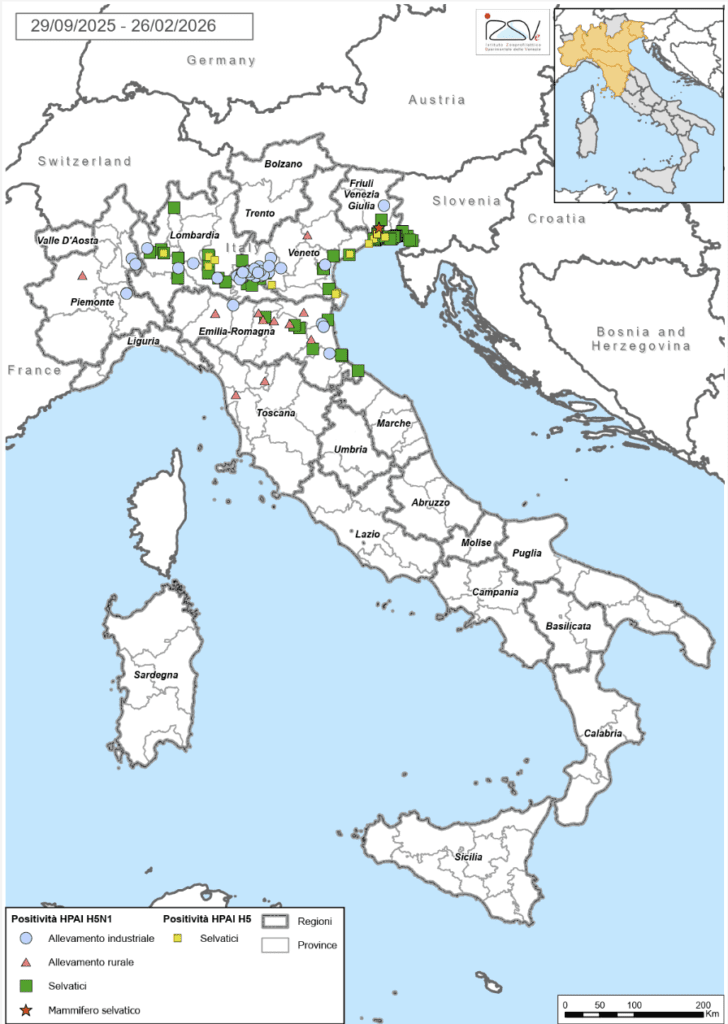 Resta confermata la concentrazione dei casi registrati tra fine 2025 e inizio 2026 nelle aree a elevata densità avicola del Nord Italia, in particolare Veneto e Lombardia (area mantovana), con interessamento prevalente di tacchini da carne e galline ovaiole.