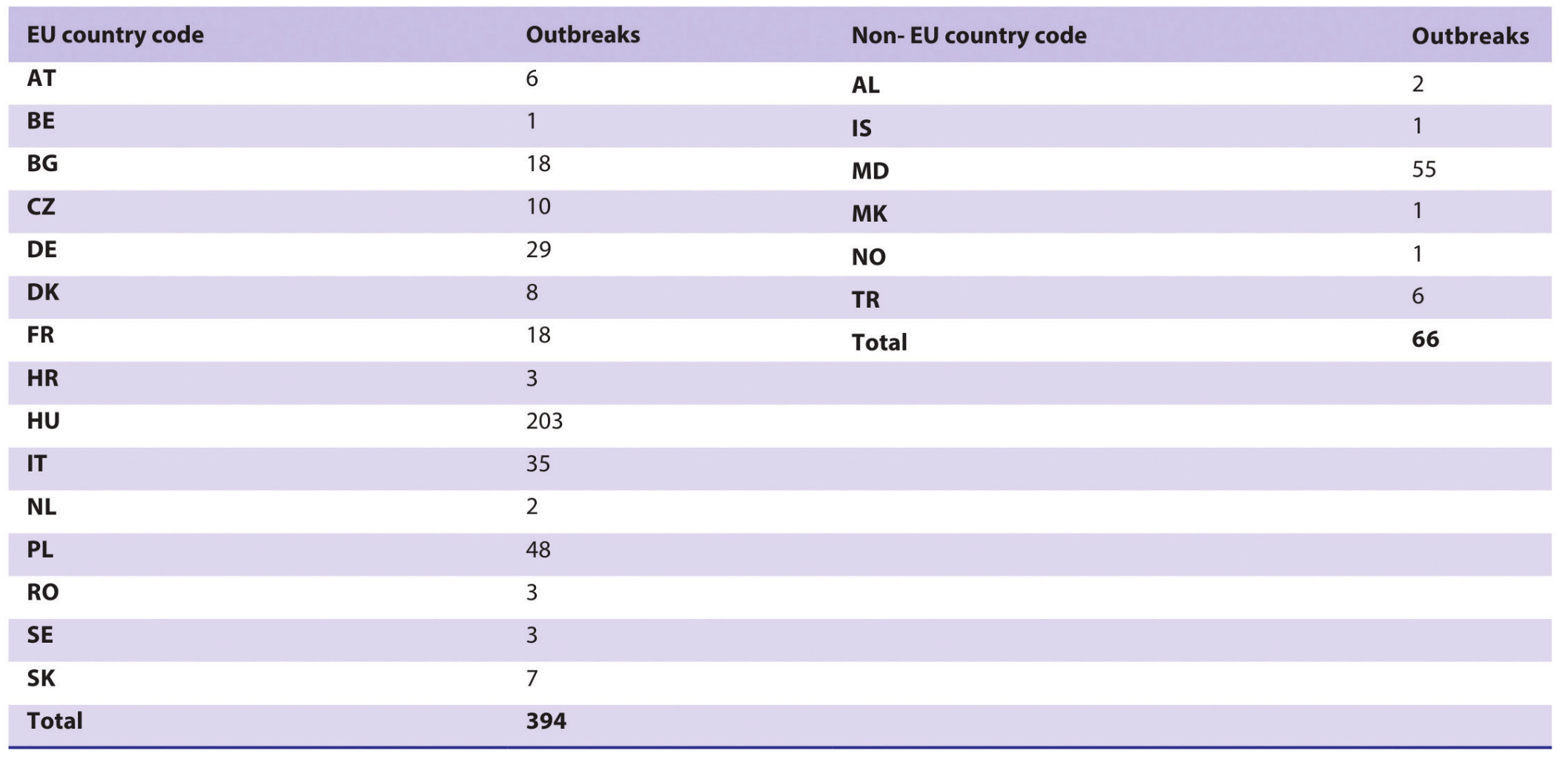 L’ADIS (Animal Disease Information System), sistema informativo dell’Unione Europea per le malattie animali, ha registrato per il 2024 ben 394 focolai nei paesi UE e 66 nei paesi non UE (Tabella 1 e Figura 1). In dettaglio, quindici paesi UE (Austria, Belgio, Bulgaria, Repubblica Ceca, Germania, Danimarca, Francia, Croazia, Ungheria, Italia, Paesi Bassi, Polonia, Romania, Svezia, Slovacchia) e sei paesi non-UE sono stati colpiti (Albania, Islanda, Moldova, Macedonia del Nord, Norvegia, Turchia).