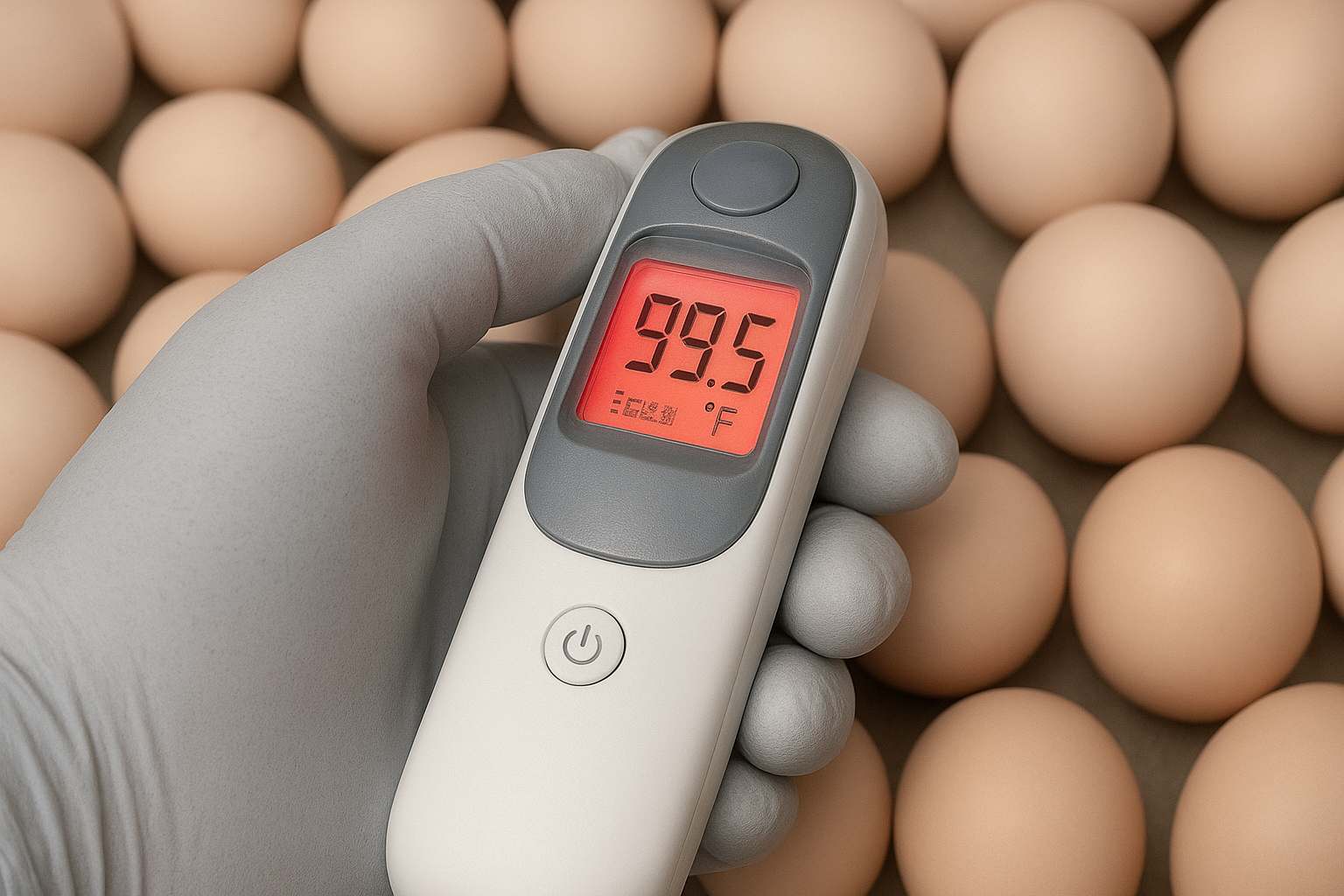 Monitoraggio della temperatura del guscio. Il monitoraggio della temperatura del guscio è uno strumento importante per valutare l’adeguatezza delle condizioni di incubazione. Gli incubatoi possono utilizzare un termometro a infrarossi o un sensore di temperatura delle uova, come il sistema OvoScan, invece di basarsi unicamente sulle misurazioni dell’aria ambiente. Questo metodo assicura che gli embrioni si sviluppino a un ritmo uniforme. Lo standard di temperatura del guscio si colloca nell’intervallo 37,6–38,3 °C.