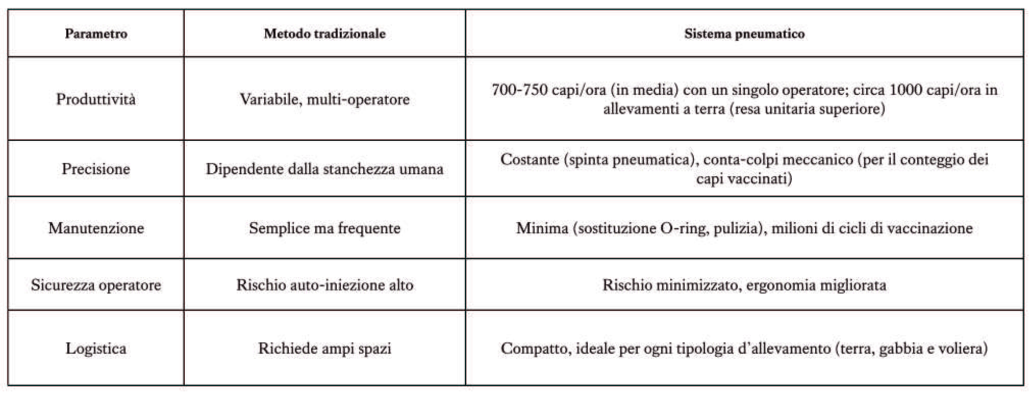 Il vantaggio competitivo più rilevante è la riduzione delle manipolazioni degli animali. Infatti, mentre il metodo tradizionale richiedeva anche fino a 4 passaggi per completare il ciclo di presa vaccinale, col nuovo metodo l’animale viene prelevato una sola volta e riceve tutti i trattamenti in sequenza rapida (spray + iniezione/i intramuscolare/i + puntura alare).