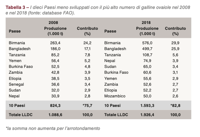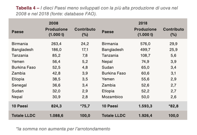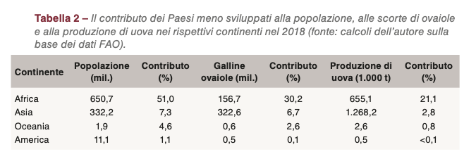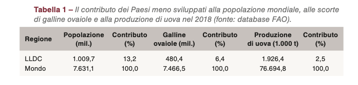 Nel 2018, 31 dei 46 Paesi meno sviluppati erano africani, 9 si trovano in Asia e 5 in Oceania: con una popolazione di 1 miliardo di persone, essi contribuivano per il 13,2% alla popolazione mondiale. I Paesi avevano un inventario di galline ovaiole pari a 480,4 milioni, che hanno prodotto 1,9 milioni di tonnellate di uova (Tabella 1). Lo squilibrio tra la popolazione e la produzione di uova è evidente.