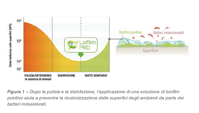 Le misure di biosicurezza nell’allevamento — in primis pulizia, detergenza, disinfezione e vuoto sanitario — incidono sul livello di pressione infettiva prima del nuovo accasamento. Il condizionamento di superfici e attrezzature tramite lo sviluppo di biofilm positivo si è rivelato un efficace strumento di integrazione ed estensione del protocollo di igiene perché contribuisce a creare un ambiente microbico favorevole dopo la procedura di disinfezione e durante il ciclo produttivo, come è stato dimostrato in allevamenti commerciali in cui il miglioramento dell’ecosistema microbico ha conseguito un impatto positivo sulla salute animale. Di conseguenza, anche le performance sono migliorate. Inoltre, i dati in vitro mostrano che l’approccio basato sul biofilm positivo può aiutare a evitare la ricolonizzazione da parte dei batteri indesiderati comunemente presenti negli allevamenti. Nel concetto odierno di One Health, garantire un ambiente microbico sicuro durante l’intero ciclo produttivo è un dovere e, pertanto, i nuovi approcci alla biosicurezza in grado di combinare la corretta disinfezione con una gestione virtuosa dell’ecosistema microbico sono attuali e incoraggianti.