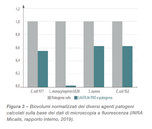 Uno studio indipendente in vitro è stato condotto presso INRA Micalis (Parigi). Tale studio ha consentito ai ricercatori di visualizzare l’interazione tra il biofilm positivo LALFILM PRO e diversi microrganismi indesiderati (Staphylococcus aureus HG003, Listeria monocytogenes LO28, Escherichia coli SS2 ed Escherichia coli 977). Le piastre sono state inoculate con LALFILM PRO o con il solo microrganismo testato (controllo). 24 ore dopo, i microrganismi testati sono stati aggiunti alle piastre colonizzate con il biofilm LALFILM PRO.